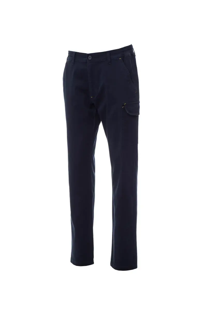 Trousers with belt loops and elastic waist, zip and button closure. Two classic front pockets, coin pocket, right side tape measure pocket, left side pocket with LOCK SYSTEM flap closure, two back pockets, one with flap and Velcro. Triple-stitched seams.